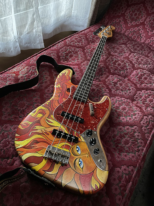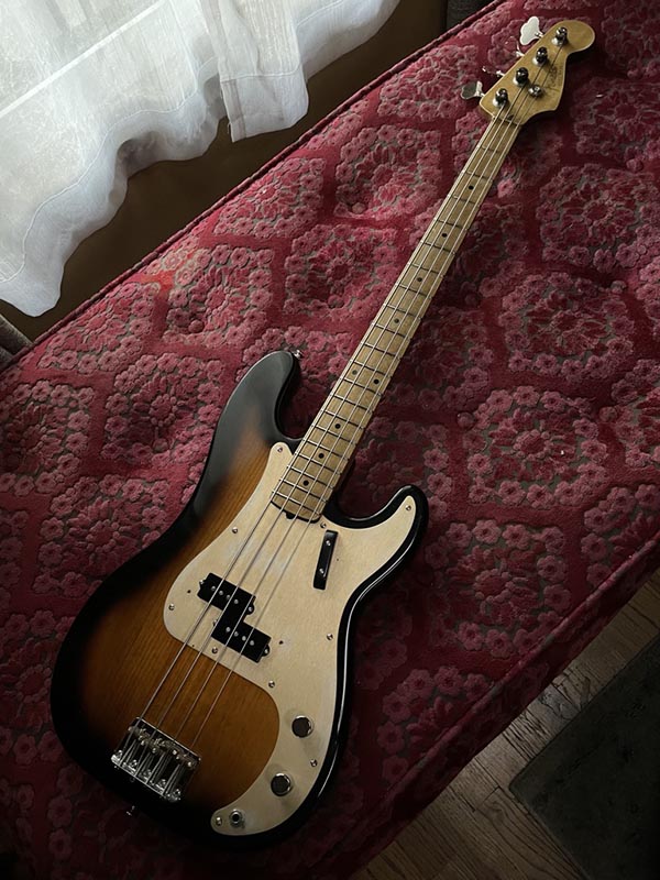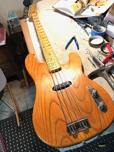 Another bass recently completed is a beautifully sounding and playing recreation of a new 1957 Fender-style Precision, smooth and thumpy with La Bella flats.