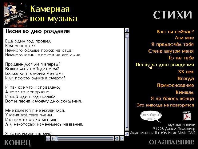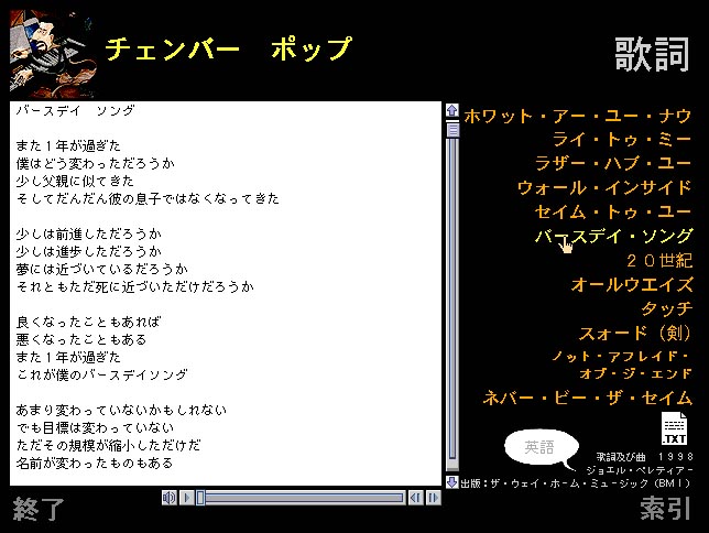 Pick a Language screenshot English Index page screenshot Japanese Index page screenshot Russian Lyrics page screenshot French Video page screenshot Geman Credits page screenshot